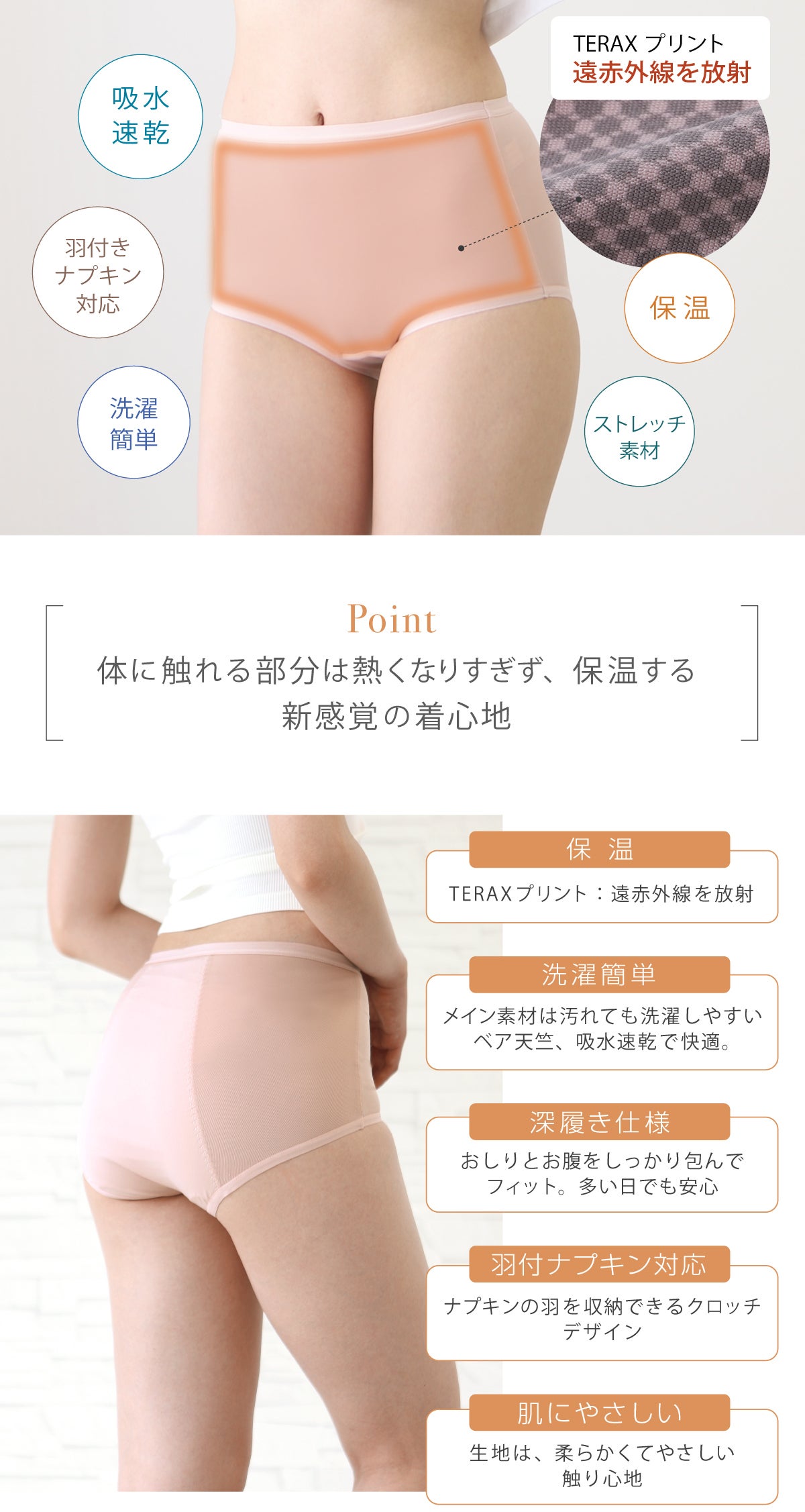 下腹部にTERAX®を使用し、遠赤外線効果で温めることを目的とした商品です。しっかり温かく、洋服にも響きにくい仕様となっているので、サニタリー期間だけではなく寒い日の冷え対策としても毎日お使いいただけます。