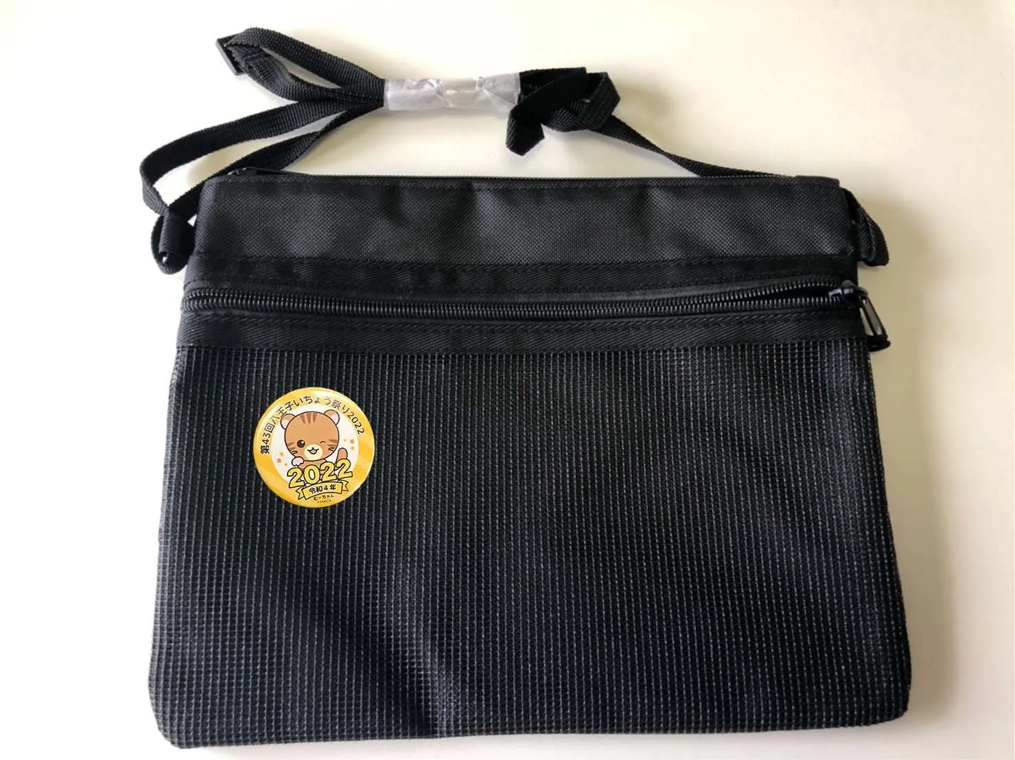八王子いちょう祭りキャラクターむささびむーちゃんの缶バッチが付いた小物が入るサコッシュ。