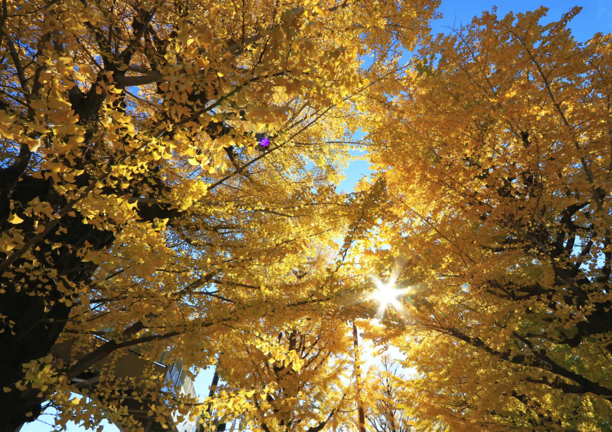 毎年、11月になると、甲州街道のいちょう並木は美しく黄葉し、いちょうの葉は黄色い花びらのように風に舞い、散り、踊り、道路や歩道一面は黄色い世界(黄金色)となり、多くの人たちはその美しさに心を和ませております。