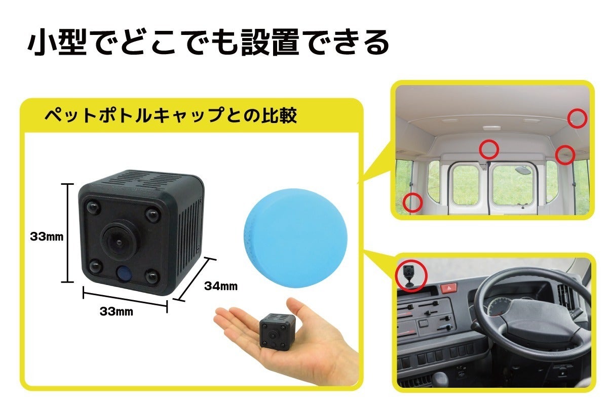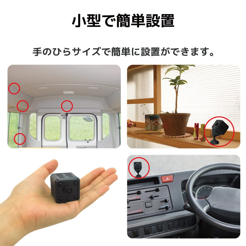 手のひらサイズの小型カメラで(約33×33×34mm)で簡単に設置ができ、取付け場所を選びません。