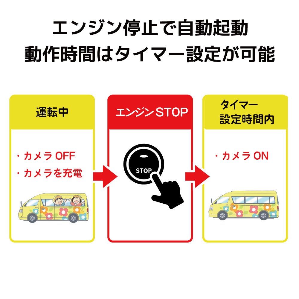 エンジン連動機能でエンジンストップにより一定時間起動します。