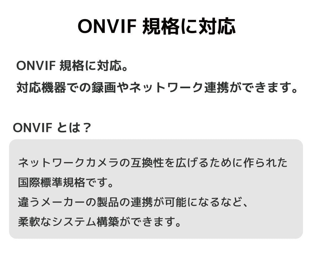 国際標準規格「ONVIF規格」に対応。対応機器での録画やネットワーク連携が可能です。