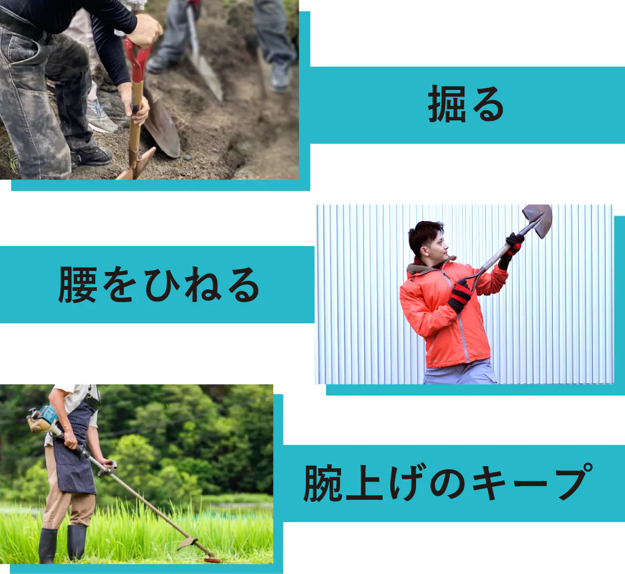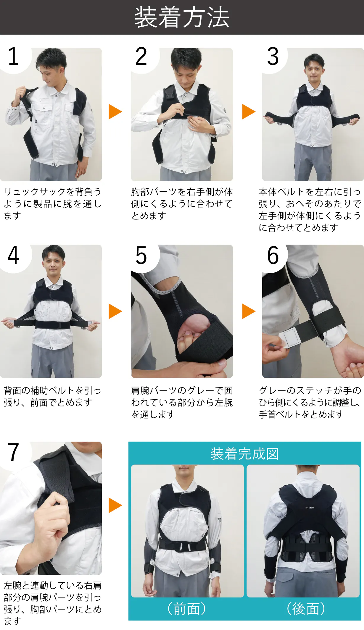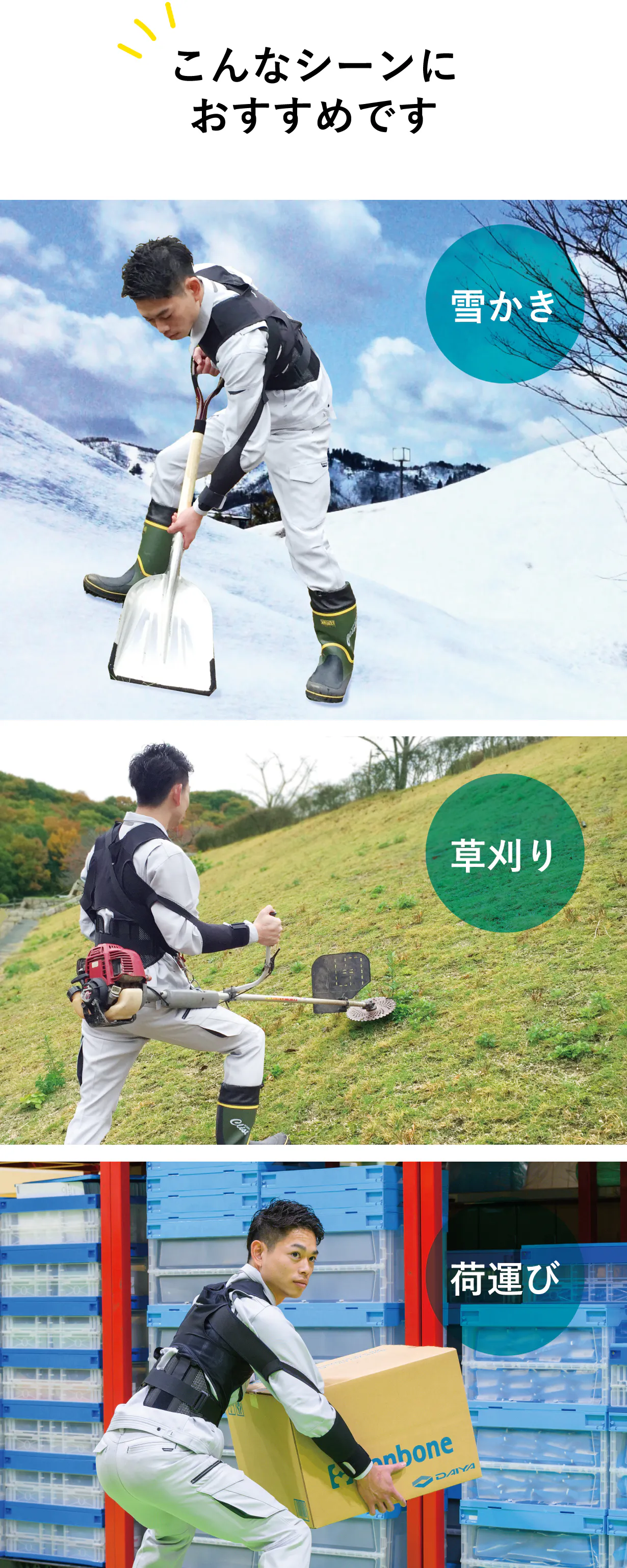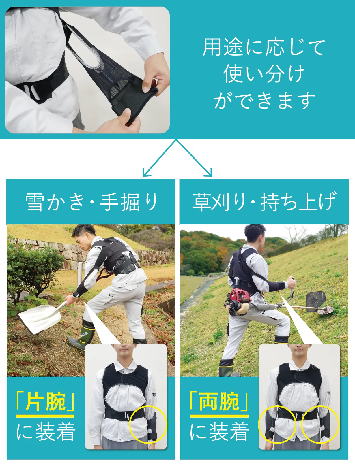 雪かきや穴掘りなど一方向にすくい上げてひねるような動作では片腕のみ装着し、草刈機の操作や荷物を持ち上げるような動作では両腕に装着することで機能を発揮します。