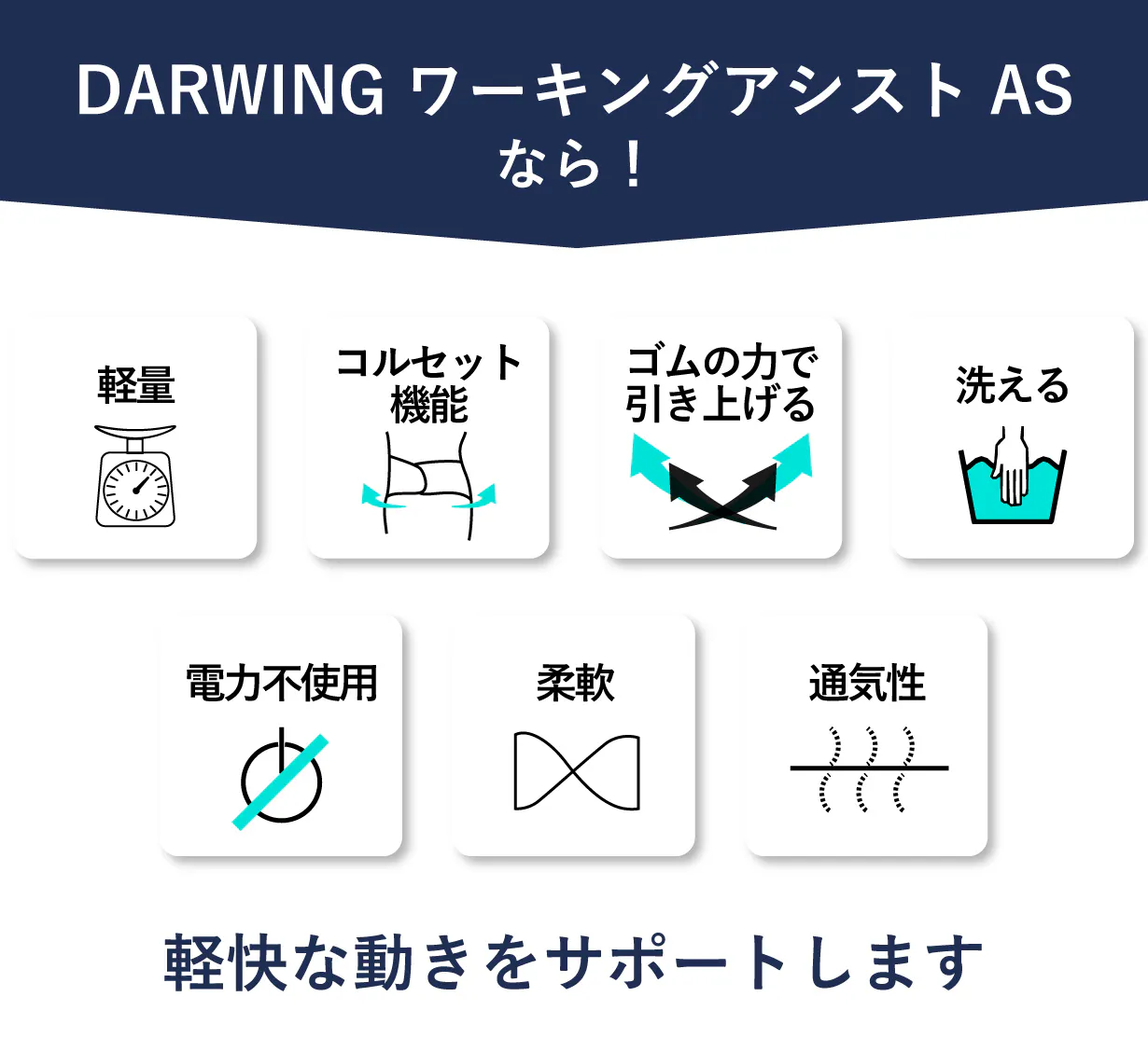 運動器のサポーティングシステムメーカーとしての長年蓄積した知見と縫製ノウハウを活かして、歩行をサポートする「DARWING Arukelude」、前傾姿勢による負担を軽減する姿勢アシストスーツ「DARWINGサージカルモデル」を開発し、クラウドファンディングでプロジェクトをおこないました。
