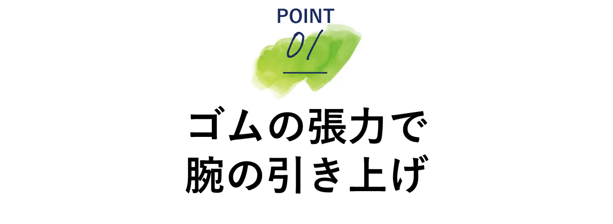たすき掛けした肩腕パーツを引っ張ることで、上体を起こす際にゴムの力で腕を引き上げる力(=アシスト力)が加わります。