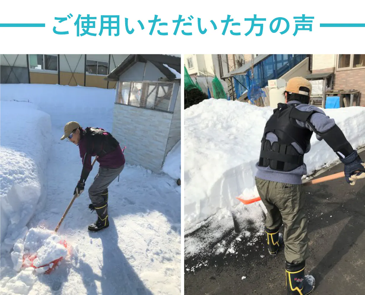 「雪が降る時期は毎日のように雪かき作業があり、腰への負担はもちろん腕が棒のように感じるほどしんどく、毎年悩みの種となっていました。今回ワーキングアシストASを装着して数週間程度雪かき作業を行ったところ、腰は安定し、腕の負担もラクになり、体感で2割程度雪の重みが軽減された印象を受けました。掘削作業はもちろん、夏には刈払機を使用した草刈り作業にも使用しています。」