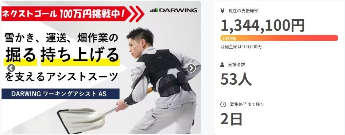 皆さま、こんにちは!DARWINGと申します。プロジェクトの目標金額を【1300%達成】すること、ネクストゴールの【100万円をクリア 】することができました!応援をしてくださった皆さま、本当に本当にありがとうございます!!心より感謝申し上げます。プロジェクト終了まであと数日となりましたが、これからも活動レポートやSNSでDARWING ワーキングアシストASを紹介していきますので、シェア・拡散していただければ大変嬉しく思います。Instagram → https://www.instagram.com/daiyak_medical/皆さまのご期待に応えられるよう尽力いたしますので、引き続きよろしくお願いいたします!!!