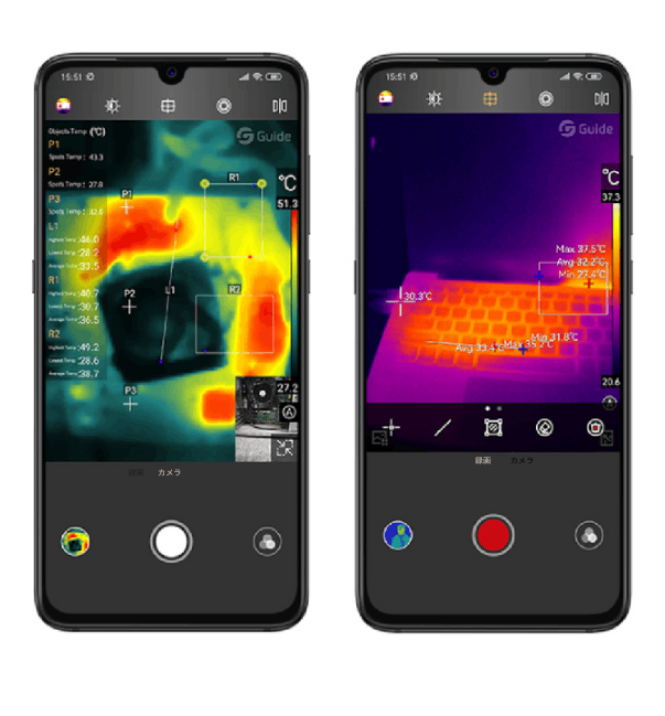 サーモグラフィ機能は熱源の温度を色別に画像化する機能です。Mobirでは一般的に知られているサーモグラフィをスマホに追加機能できます。