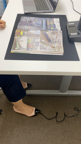 パソコンのマウスや付属のハンドボタン、フットペダルを使って本をペラペラめくる感覚でリズミカルにスキャンが可能です。
