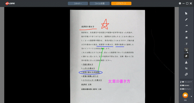 スキャンした画像に手書き風の書き込みや、ワープロ文字を打ち込める機能です。スキャンした文章にマークをした時やメモ書きしたい時に使うと大変便利。