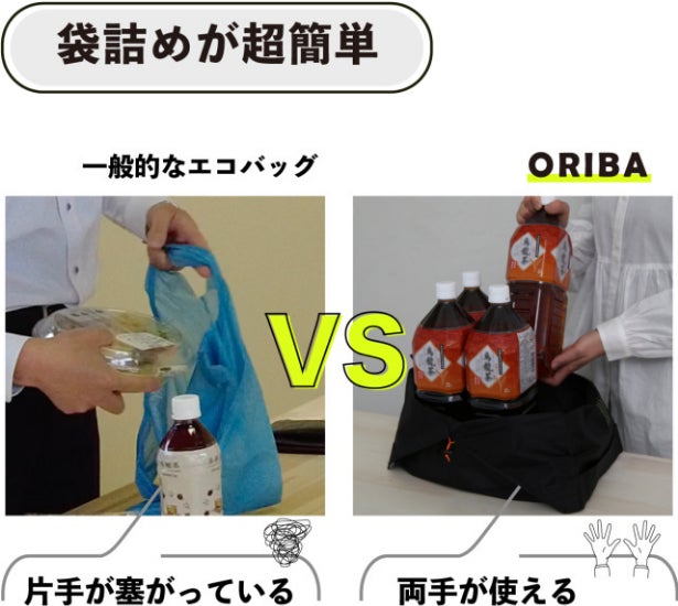 もし、コンビニやスーパーで、エコバッグが(畳んだ状態から)1秒で自立したら、袋詰めがラクになると思いませんか?ORIBA(オリバ)は、袋詰め時の入れやすさにこだわった今までにないコンセプトのエコバッグです。