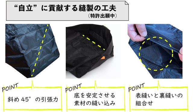 ORIBA(オリバ)シリーズは、生地自体の硬さではなく、縫製の工夫や設計時のアイデアで自立する仕組みを構築したため、限りなく薄い生地で「自立」を実現しました。