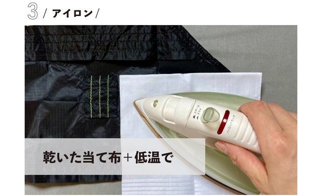 A:低温で当て布(乾いた布)を使用して、アイロン掛けが可能です。※ 濡れた布を当て布にすると、当て布に色移りする場合があります。
