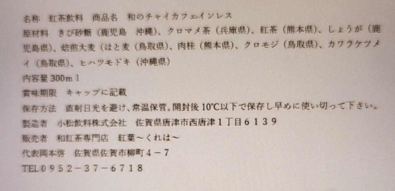 ・原材料名:きび砂糖(鹿児島 沖縄)、クロマメ茶(兵庫県)、紅茶(熊本県)、しょうが(鹿児島県)、焙煎大麦(国産)はと麦(鳥取県)、肉桂(熊本県)、クロモジ(鳥取県)、カワラケツメイ(鳥取県)、ヒハツモドキ(沖縄県)