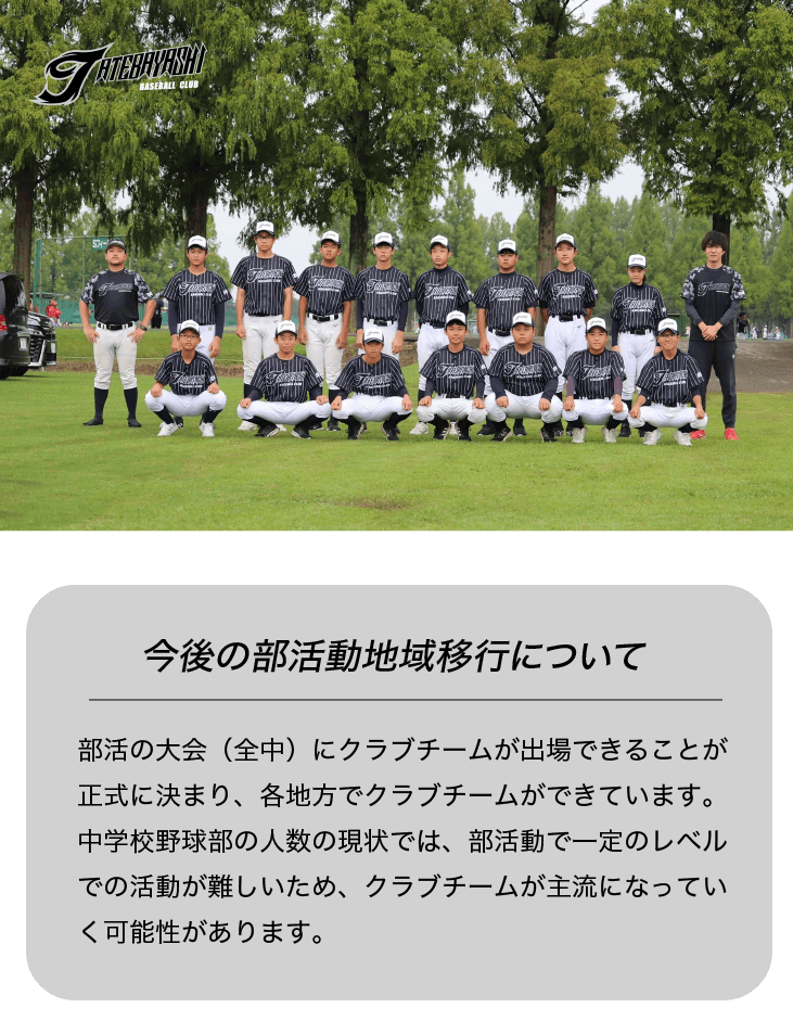 初めまして。館林ベースボールクラブ代表の岡田と申します。この度部活動の縮小、部活動の地域移行化を受け、群馬県館林市に中学軟式クラブチーム「館林ベースボールクラブ」を立ち上げました。