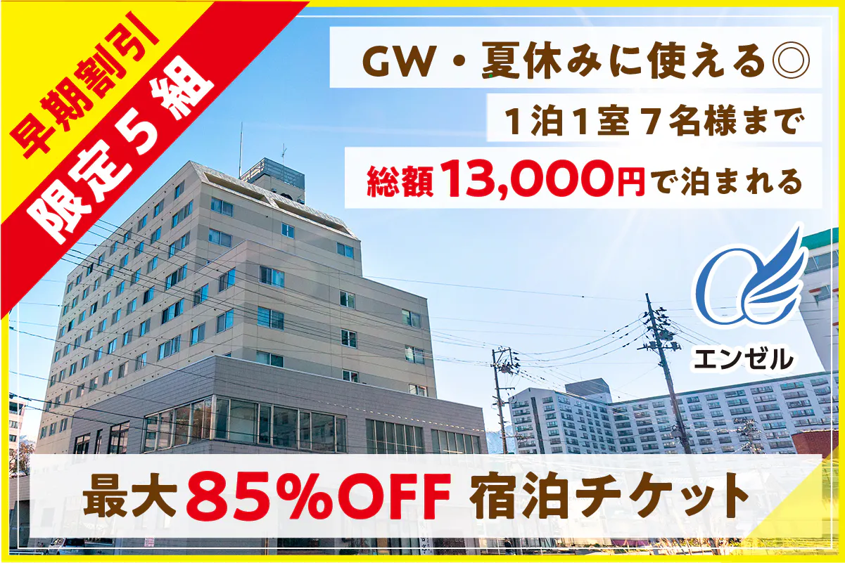 【早期割引限定5組】GW・夏休みに使える◎1泊1室7名様まで総額13,000円で泊まれる最大85%OFF宿泊チケット