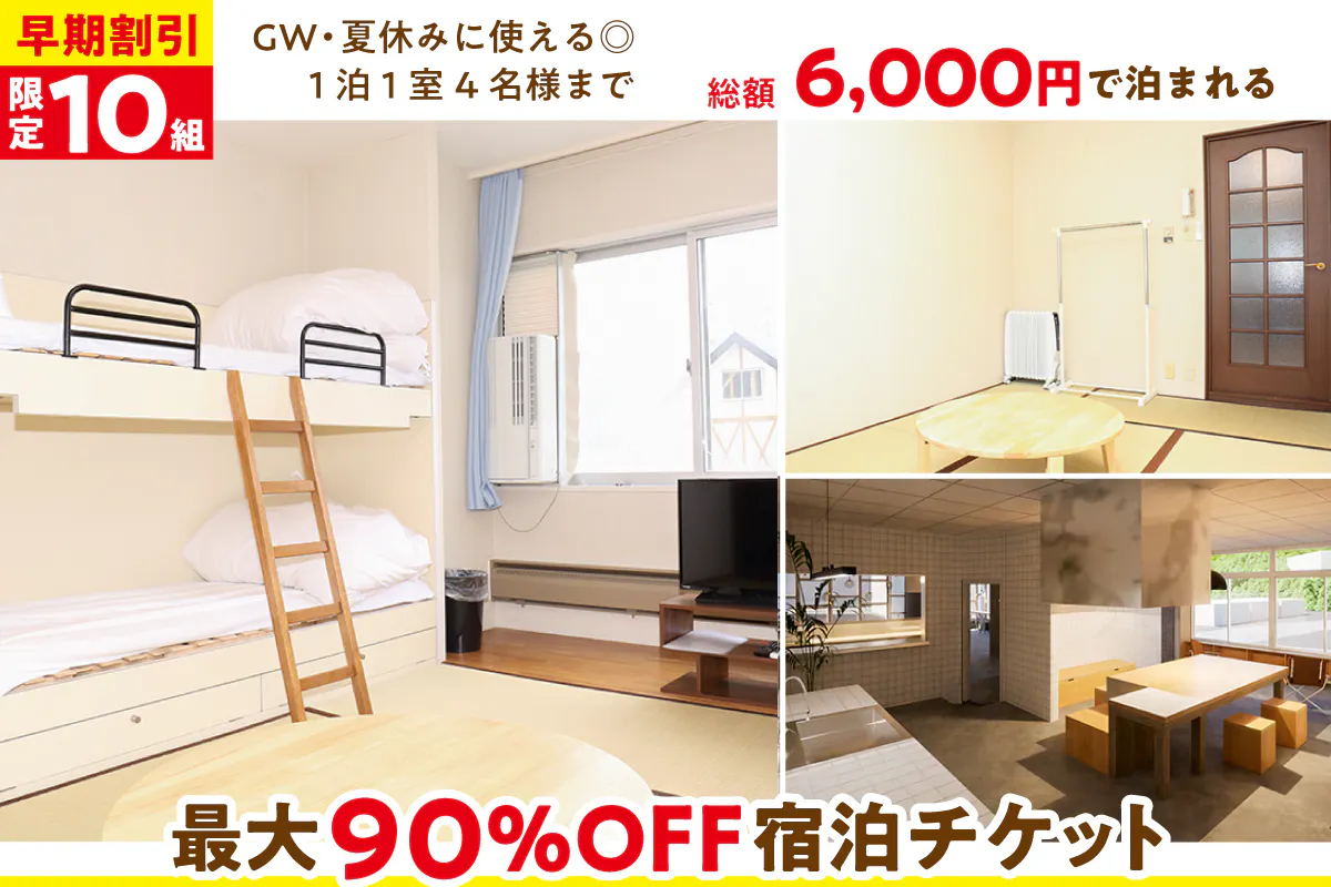 GW・夏休みに使える◎1泊1室4名様まで総額6,000円で泊まれる最大90%OFF宿泊チケット