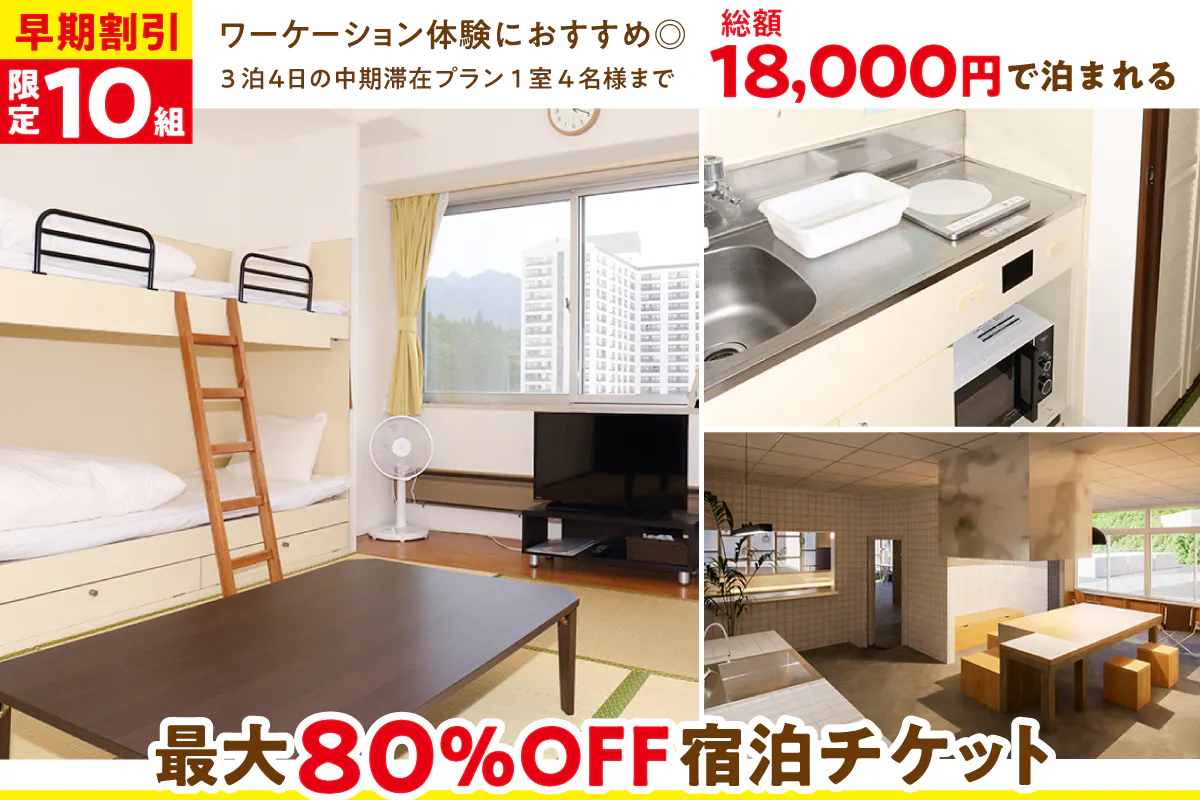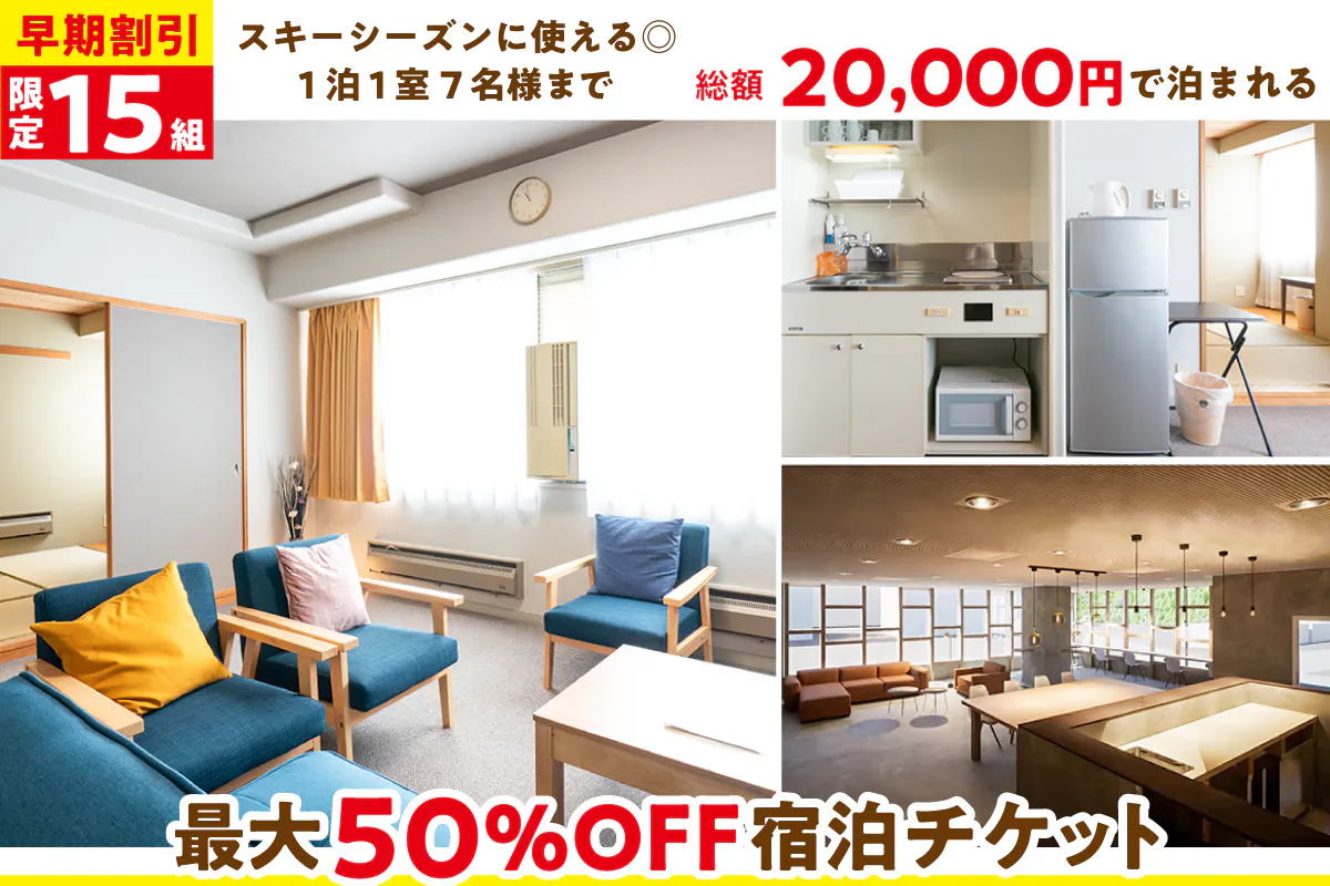 スキーシーズンに使える◎1泊1室7名様まで総額20,000円で泊まれる最大50%OFF宿泊チケット
