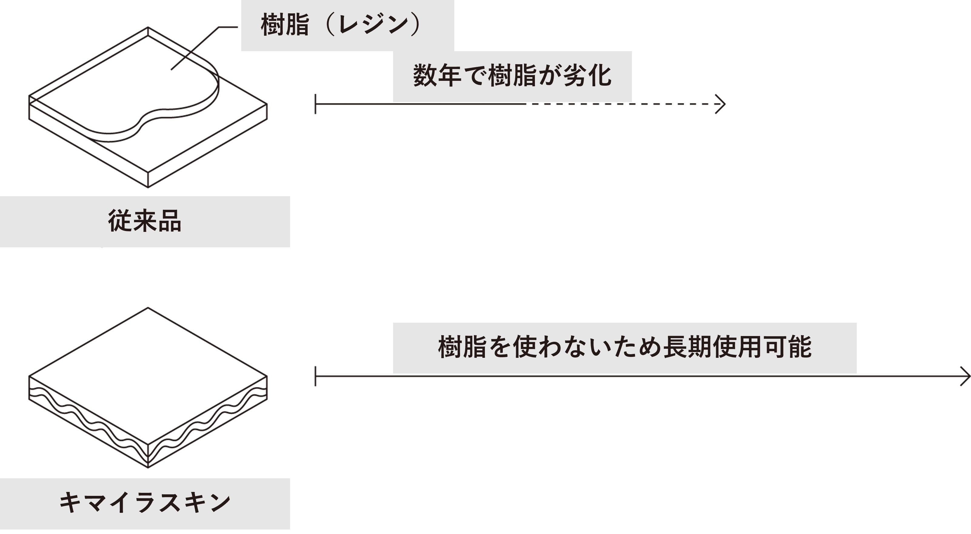 「キマイラ スキン® コート」では、劣化の早い樹脂を使わない特殊製法を採用しており、長期使用が可能なロングライフで、サステナブルな商品です。