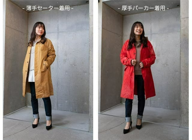 また、寒さが強い時期は、インナーダウンや厚手のスウェットなどを内側に着用頂く事で、防寒性と軽やかな着こなしの両立を楽しめます。春・秋・冬の3シーズンに対応できる非常に使い勝手の良いコートです。