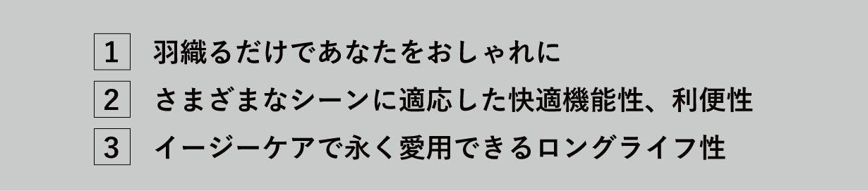 そのコートとしての圧倒的な軽量感、今までにない着用感は、あなたの外出を劇的に快適なものに変えます。