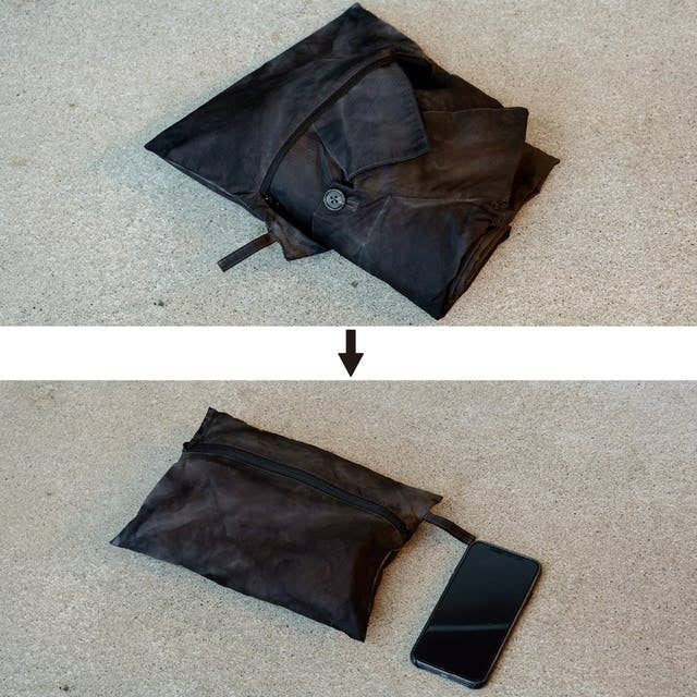 この超コンパクトな収納袋に3cm程度の厚みで簡単に収まる驚きの極小コンパクト性能を、ぜひご確認ください。