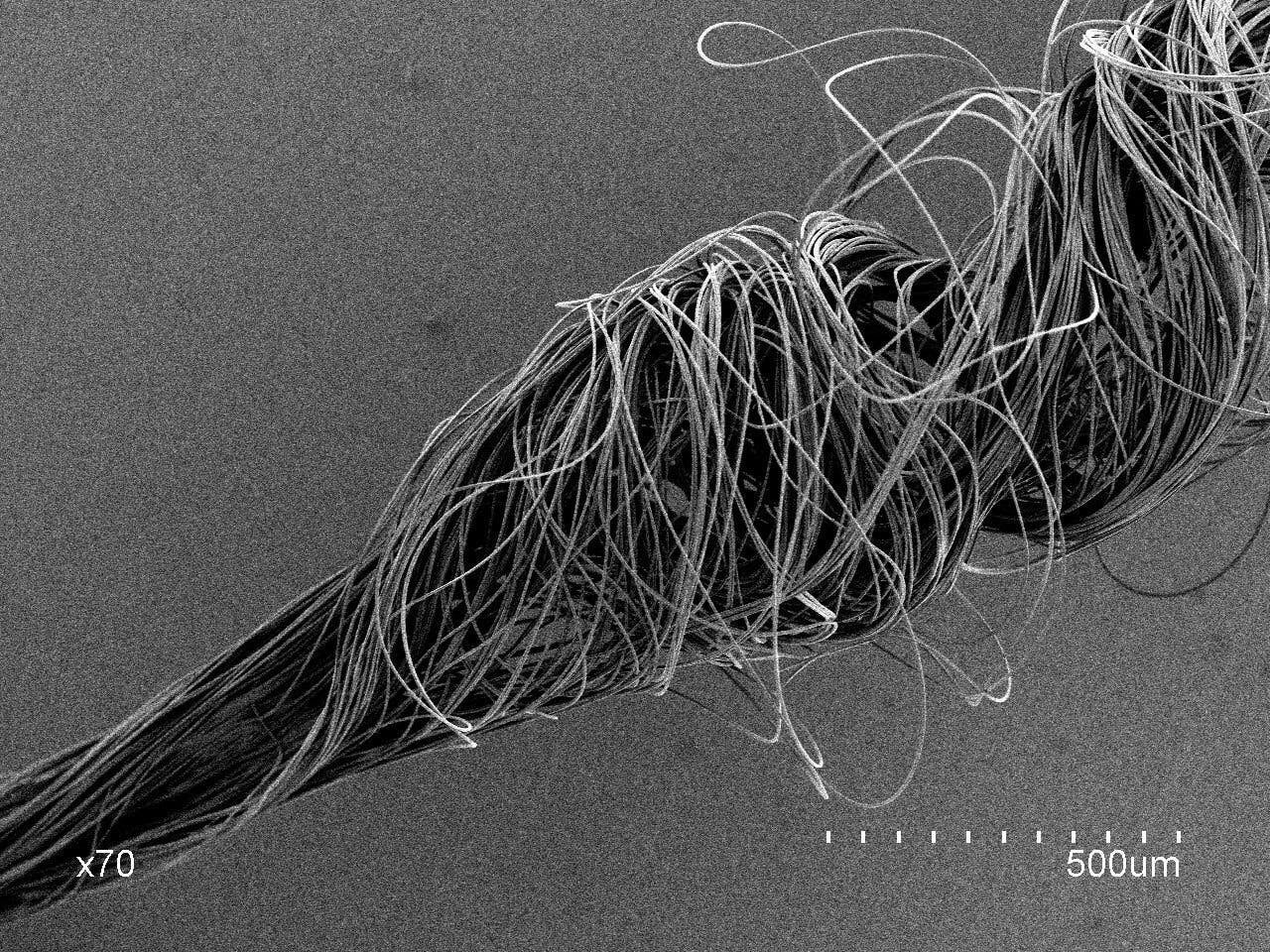A:ポリエステル100%となります。東レの複合紡糸技術「NANODESIGN®」による単糸繊度0.19デシテックスの超極細でありながらバイメタル構造を持つ、世界でも東レでしか生産していない希少な特殊ポリエステルを使用しています。