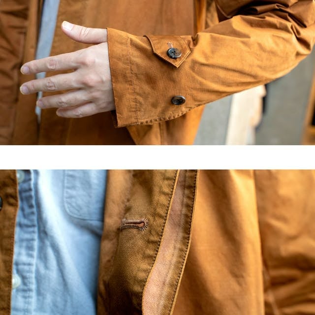 「キマイラ スキン® コート」は、0.3mmの極薄ながらしっかりとした手持ち感と、上質なレザー/オイルドコットンを彷彿とさせるヌメ感、加えてヴィンテージレザー調のゆらぎある美しい唯一無二の表面感をもつ東レの最新の先端素材「キマイラ スキン®」を使用しています。