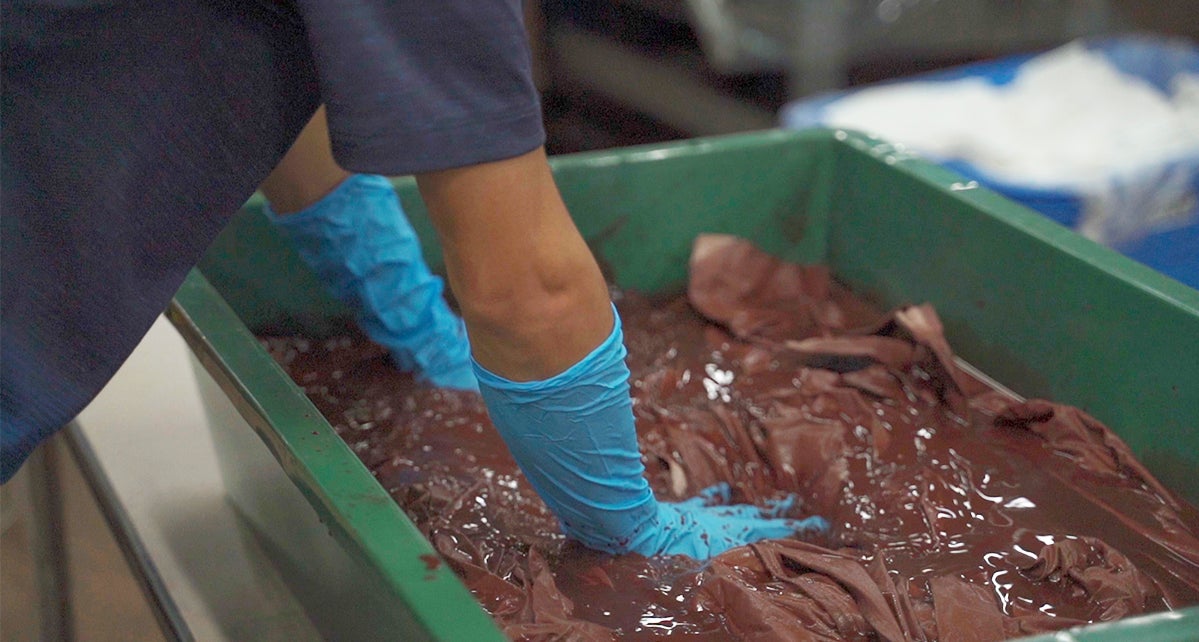 今回のプロジェクトでは、高度な「製品染め」技術の中でも特別に、「小松マテーレ」のプロフェッショナルな熟練技術者が1枚1枚手作業で染色を行う特例的な手法で、高品位なヴィンテージ感を表現する事に成功しています。