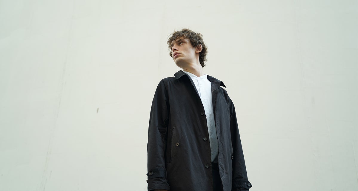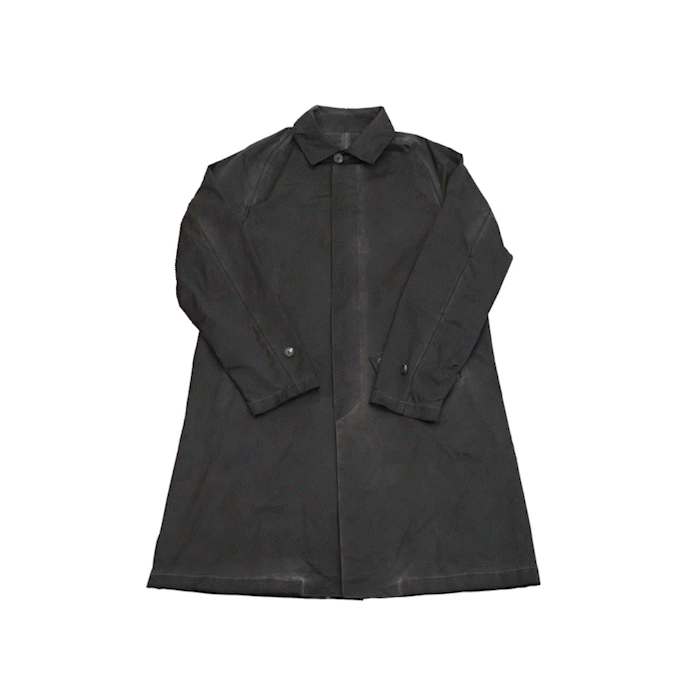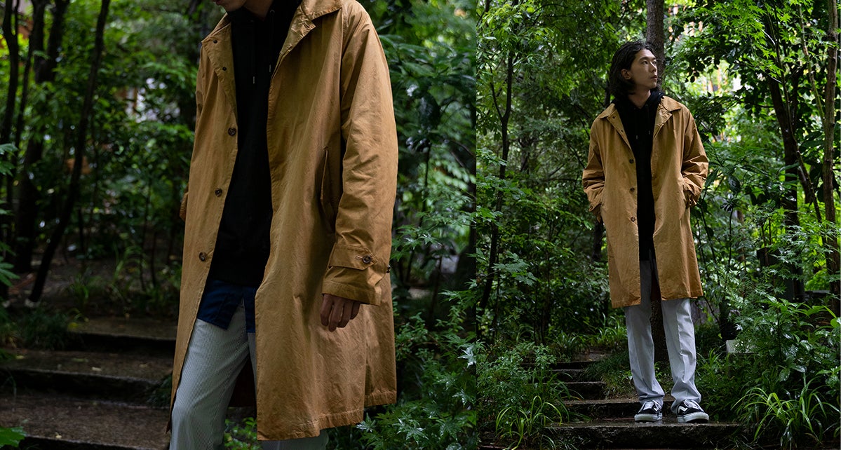 ステンカラーコートは比翼仕立て(隠しボタン)のシンプルなデザインで、素材の差異が商品品位に直結する商品であり、またラグラン袖で肩可動に適した仕様から、機能性コートの元祖でもあります。