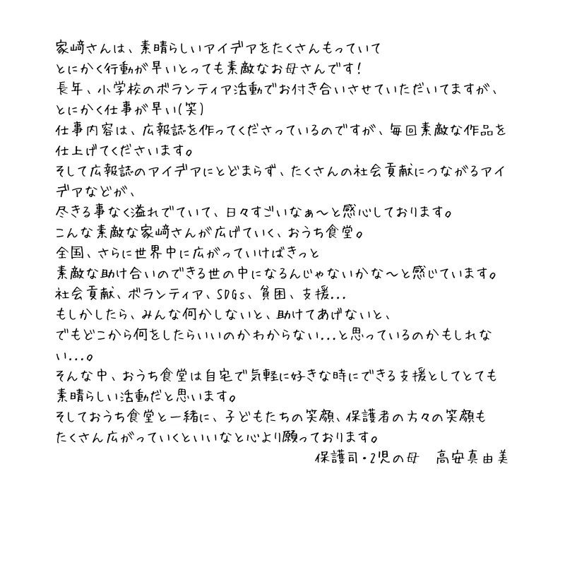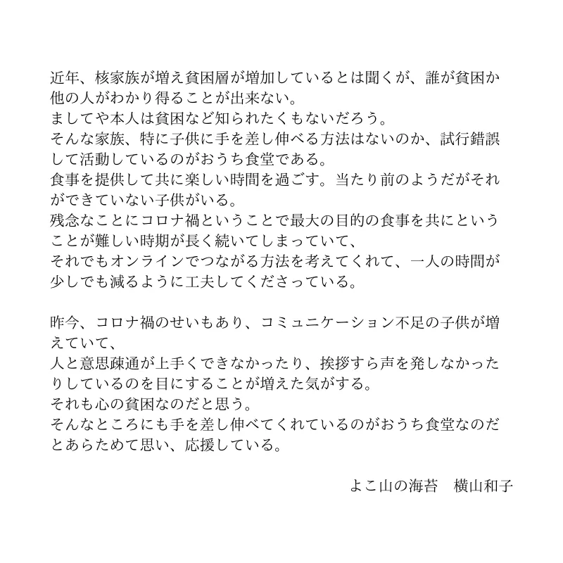 「おうち食堂ネットワーク」のロゴが知れ渡り、これを見て子どもたちが個人宅に安心して訪れる日が来ることを願うと共に、