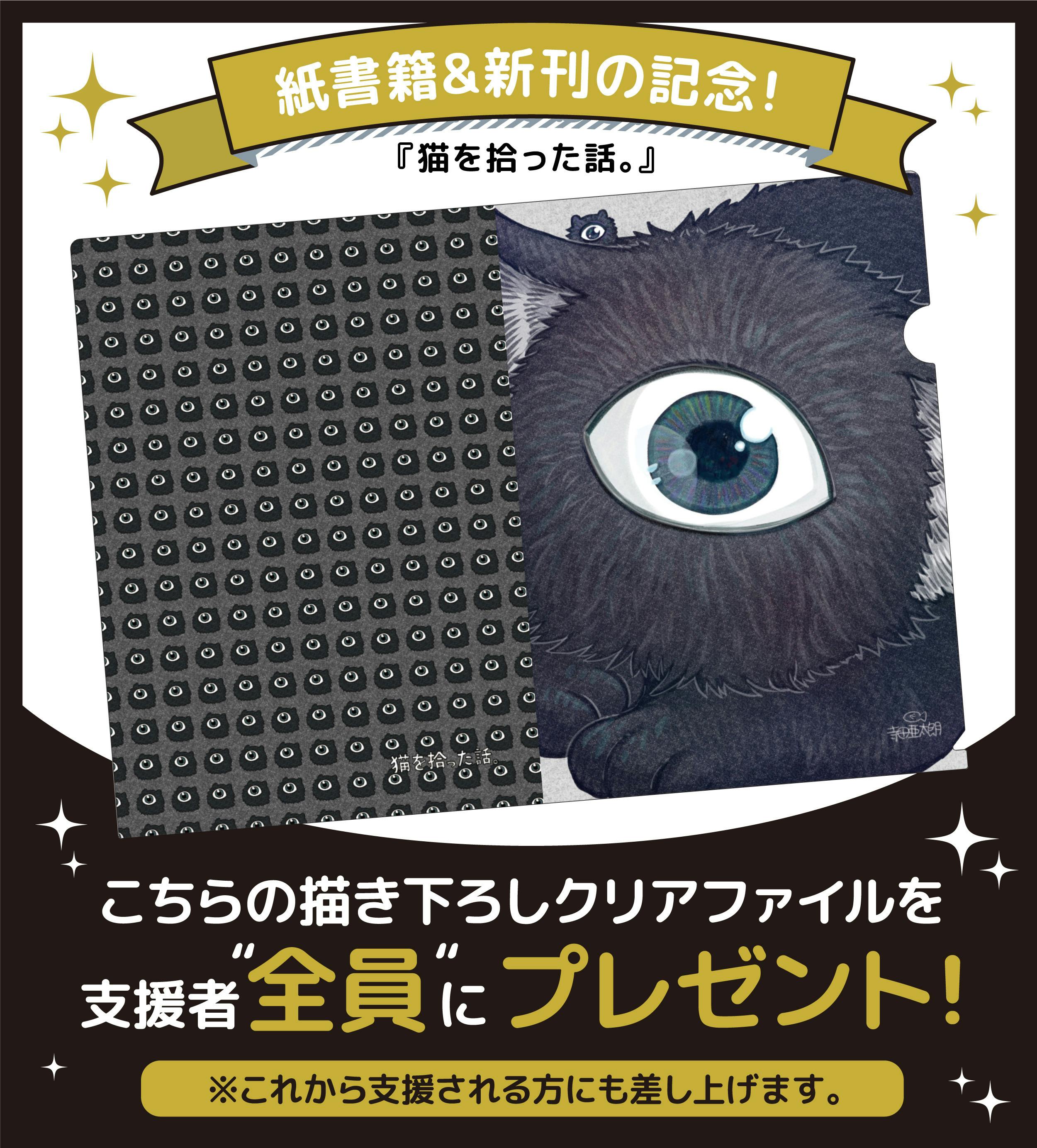 2022/10/18 12:02CAMPFIRE Creationスタッフです。支援様の皆様、熱いご支援誠にありがとうございますこの度「猫を拾った話。」の紙書籍&新刊を記念してクラファン支援者様「全員」に描き下ろしクリアファイルをプレゼントいたします!描き下ろしのA4サイズの迫力のあるデザインです。これから支援される方も対象なのでぜひご支援検討ください!プロジェクトは今週末までとなりますので最後まで応援よろしくお願いいたします。 もっと見る