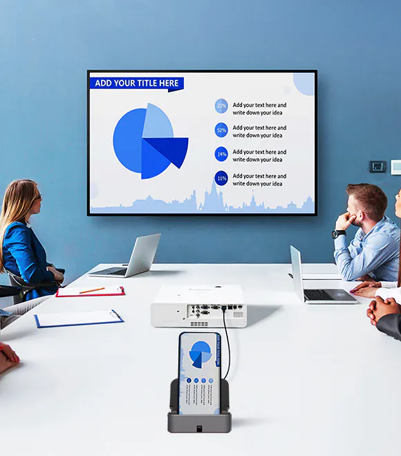 【TRANX】があれば、HDMIやVGAポートを使って会議室のプロジェクターに繋げることが出来ます。