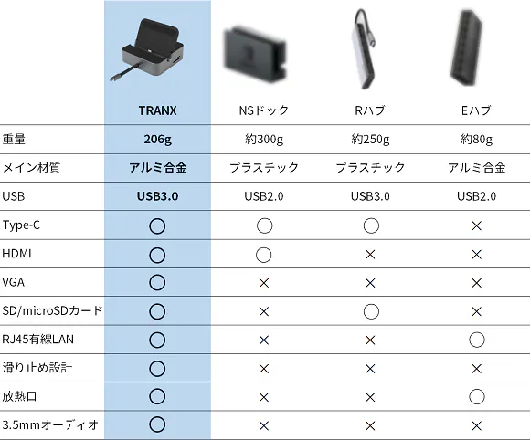 Switchドックが持つ機能は、【TRANX】にも全部収納されています。