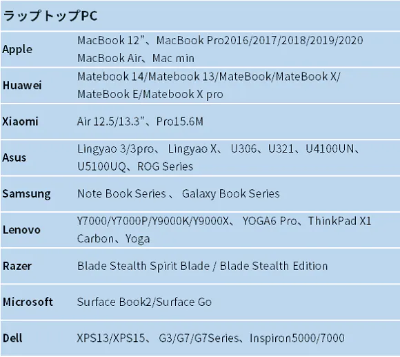 ※ HDMIやVGA端子からディスプレイに出力する際は、画面を出力する端末(スマホ、パソコン)が下記に対応している必要があります。