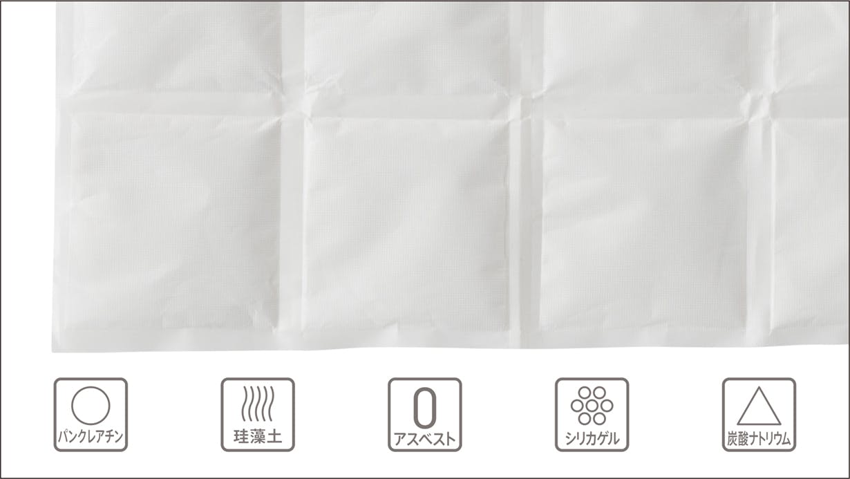 インナーには珪藻土とシリカゲルに加え、特に清潔さ向上のため、脂肪たんぱく分解酵素パンクレアチンを入れました。パンクレアチンは吸収する水に含まれる微量の皮脂の分解を助け、清潔さを保ちます!