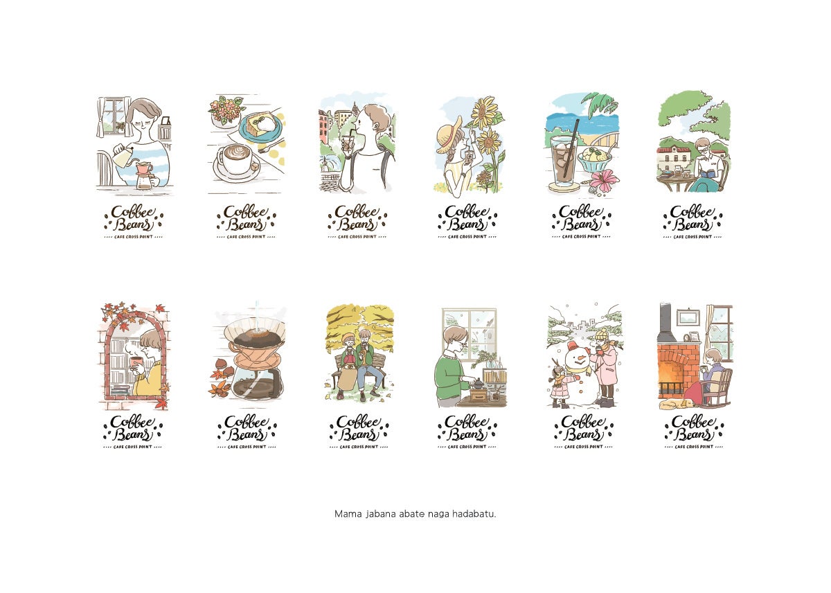 これまでイラストが12種もあるのに個別で使うシーンしかなく、全てを網羅した1枚絵は存在していませんでした。春夏秋冬、季節は巡るしそこに区切りは無いはず。コーヒーを飲んだり淹れたりするシーンで季節の移ろいを感じる1枚絵は絶対良いぞ、と。