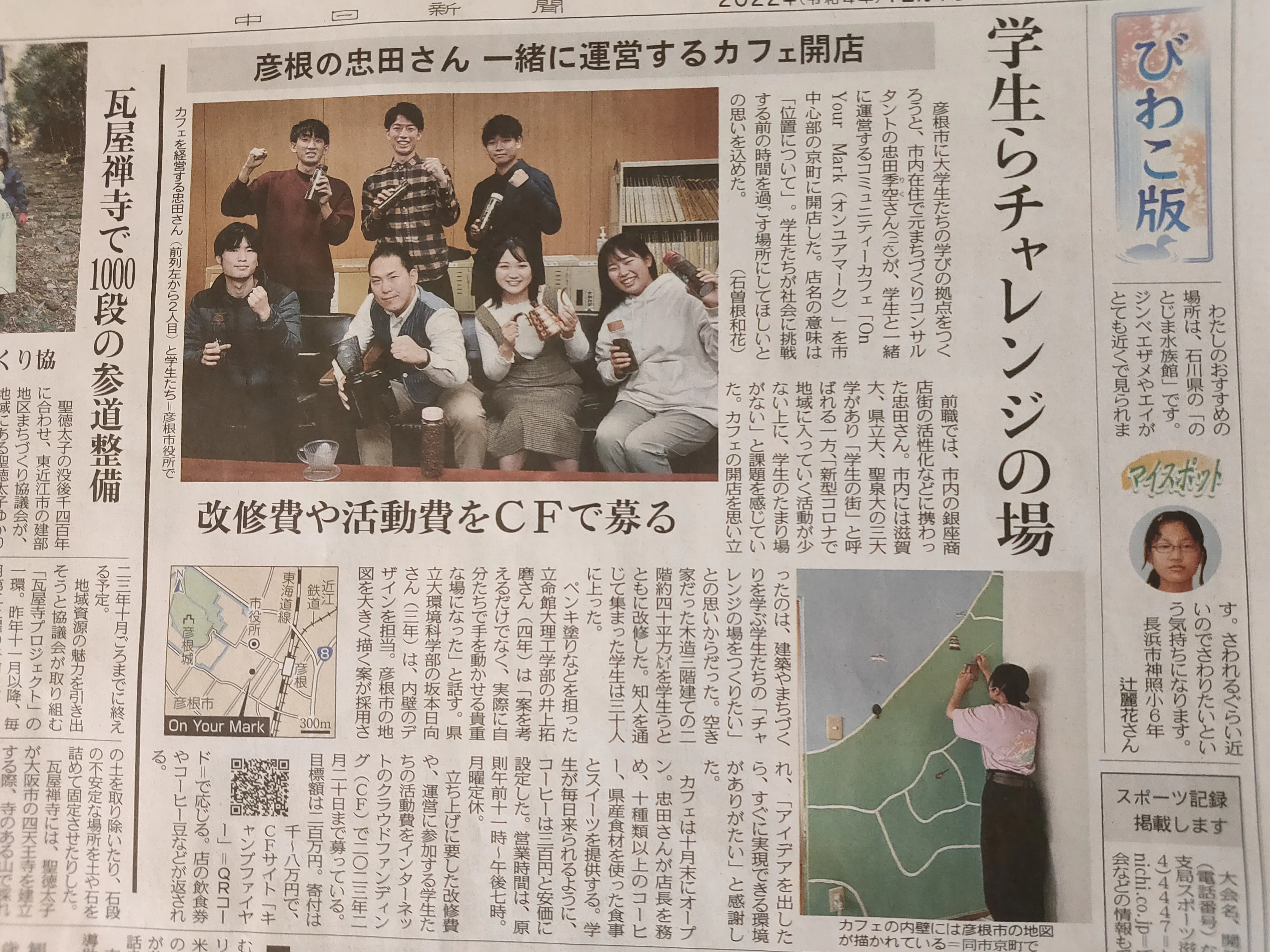2022/12/17 17:56ページを見ていただきありがとうございます。ご支援をいただきました方には心より感謝申し上げます!先日の中日新聞様のびわこ版にて、本プロジェクトの活動とクラウドファウンディング開始の記事を載せていただきました!ありがたいことに彦根市役所で記者会見をセッティング・取材をいただき、学生達にとっては初の記者会見!滋賀県立大学・立命館大学・龍谷大学の3校の学生さんと一緒に参加させていただきましたが、僕も含めて皆緊張の面持ちでした…!「コロナのせいで入学からの2年間、大学らしい学びを全くできなかった」という学生の悲痛な訴えから始まったプロジェクトですが、参加してこのような機会を掴み取ったことは自慢できると思います。また、次代のこうした活躍は地域にも注目いただいているのではないかと、この大きな記事で感じます。やる気溢れる学生の活動を全力でサポートし、実施することができる場所にして、大学としてではなく個人の頑張りにフォーカスして頑張りに日の目を見せることこそが、本プロジェクトの一番の価値と思います。そしてその結果、地域に新たな活力が生み出されることを目指します。リノベもまだまだ道半ば、多くの学生達が地域のことを考えてこれからも活動をしてまいりますので、何卒温かいご支援をよろしくお願い申し上げます!! もっと見る
