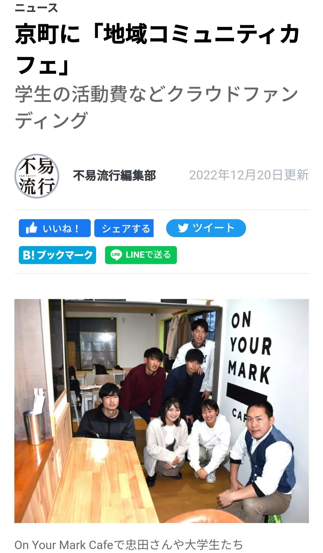 2022/12/21 14:18プロジェクトページをご覧いただき誠にありがとうございます!ご支援をいただきました方には心よりお礼を申し上げます!さて、昨日のことになりますが本プロジェクトの活動とクラウドファウンディング公開について、彦根商工会議所さんが発行されている地域情報誌の「不易流行」に記事として取り上げていただきました!実はこちらに載せていただけると知らなかったのでいきなり自分たちが出てきてビックリ!(笑)ただこうして学生達の活動や想いが地域に注目していただけることは本当にありがたいことと感じます。気づけば年の瀬。本プロジェクトを始めて僕自身や学生さんも色々なことがあった一年間でしたが、本当に様々な方から支えられての一年間でした。また、学生・次代のためと言って学生を支える活動をしているつもりが学生に支えられることの方が多かったと噛みしめております。正に種まきのようなプロジェクトであり、先の長い取組となりますが、来年も彼ら・彼女ら、写真には写っていない学生さん、そして新たな学生さん達・地域の方々と共に頑張ってまいりたいと思いますので、皆さま何卒温かいご支援をよろしくお願い申し上げます!PS.来年はさらに大所帯になることが決まっています…! もっと見る