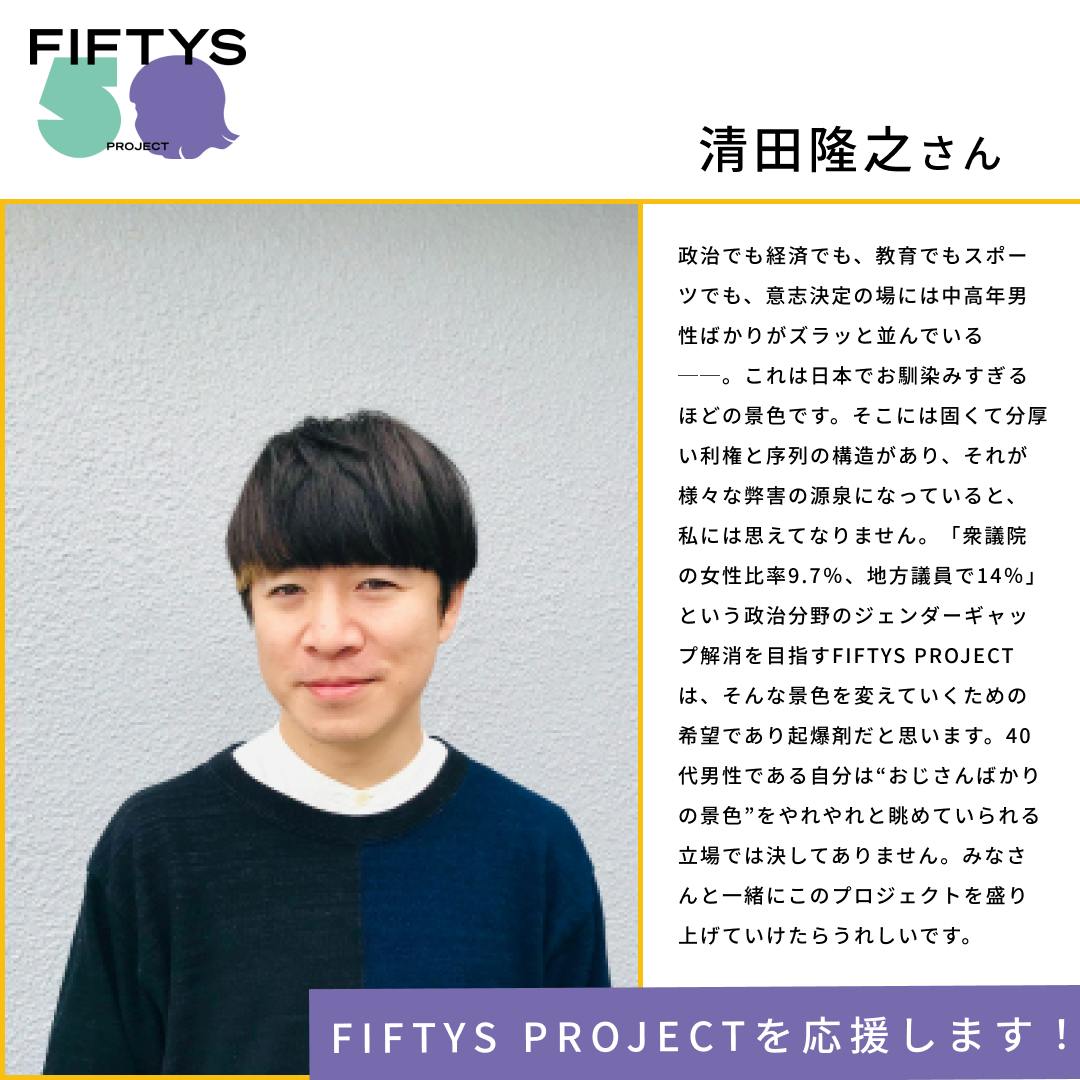 『政治でも経済でも、教育でもスポーツでも、意志決定の場には中高年男性ばかりがズラッと並んでいる──。これは日本でお馴染みすぎるほどの景色です。そこには固くて分厚い利権と序列の構造があり、それが様々な弊害の源泉になっていると、私には思えてなりません。「衆議院の女性比率9.7%、地方議員で14%」という政治分野のジェンダーギャップ解消を目指すFIFTYS PROJECTは、そんな景色を変えていくための希望であり起爆剤だと思います。40代男性である自分は“おじさんばかりの景色”をやれやれと眺めていられる立場では決してありません。みなさんと一緒にこのプロジェクトを盛り上げていけたらうれしいです。』