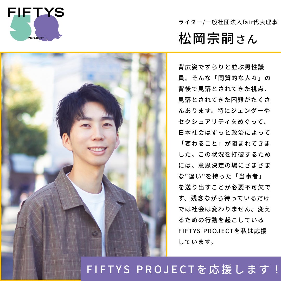 【ライター/一般社団法人fair代表理事 松岡宗嗣さんからの応援メッセージ】『背広姿でずらりと並ぶ男性議員。そんな「同質的な人々」の背後で見落とされてきた視点、見落とされてきた困難がたくさんあります。特にジェンダーやセクシュアリティをめぐって、日本社会はずっと政治によって「変わること」が阻まれてきました。この状況を打破するためには、意思決定の場にさまざまな"違い"を持った「当事者」を送り出すことが必要不可欠です。残念ながら待っているだけでは社会は変わりません。変えるための行動を起こしているFIFTYS PROJECTを私は応援しています。』============================松岡宗嗣さんとのコラボ書籍リターン「あいつゲイだって アウティングはなぜ問題なのか」は残りわずかです!本当にありがとうございます!