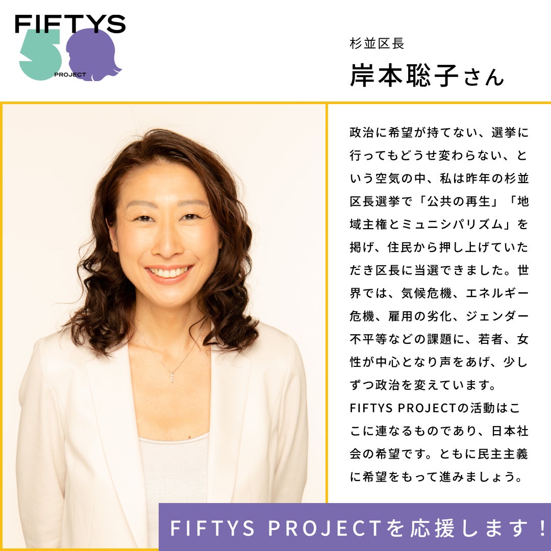 【杉並区長 岸本聡子さんからの応援メッセージ】『政治に希望が持てない、選挙に行ってもどうせ変わらない、という空気の中、私は昨年の杉並区長選挙で「公共の再生」「地域主権とミュニシパリズム」を掲げ、住民から押し上げていただき区長に当選できました。世界では、気候危機、エネルギー危機、雇用の劣化、ジェンダー不平等などの課題に、若者、女性が中心となり声をあげ、少しずつ政治を変えています。FIFTYS PROJECTの活動はここに連なるものであり、日本社会の希望です。ともに民主主義に希望をもって進みましょう。』==========================私たちの憧れ、岸本聡子区長!これまでもイベントに登壇いただきました。本当にありがとうございます!