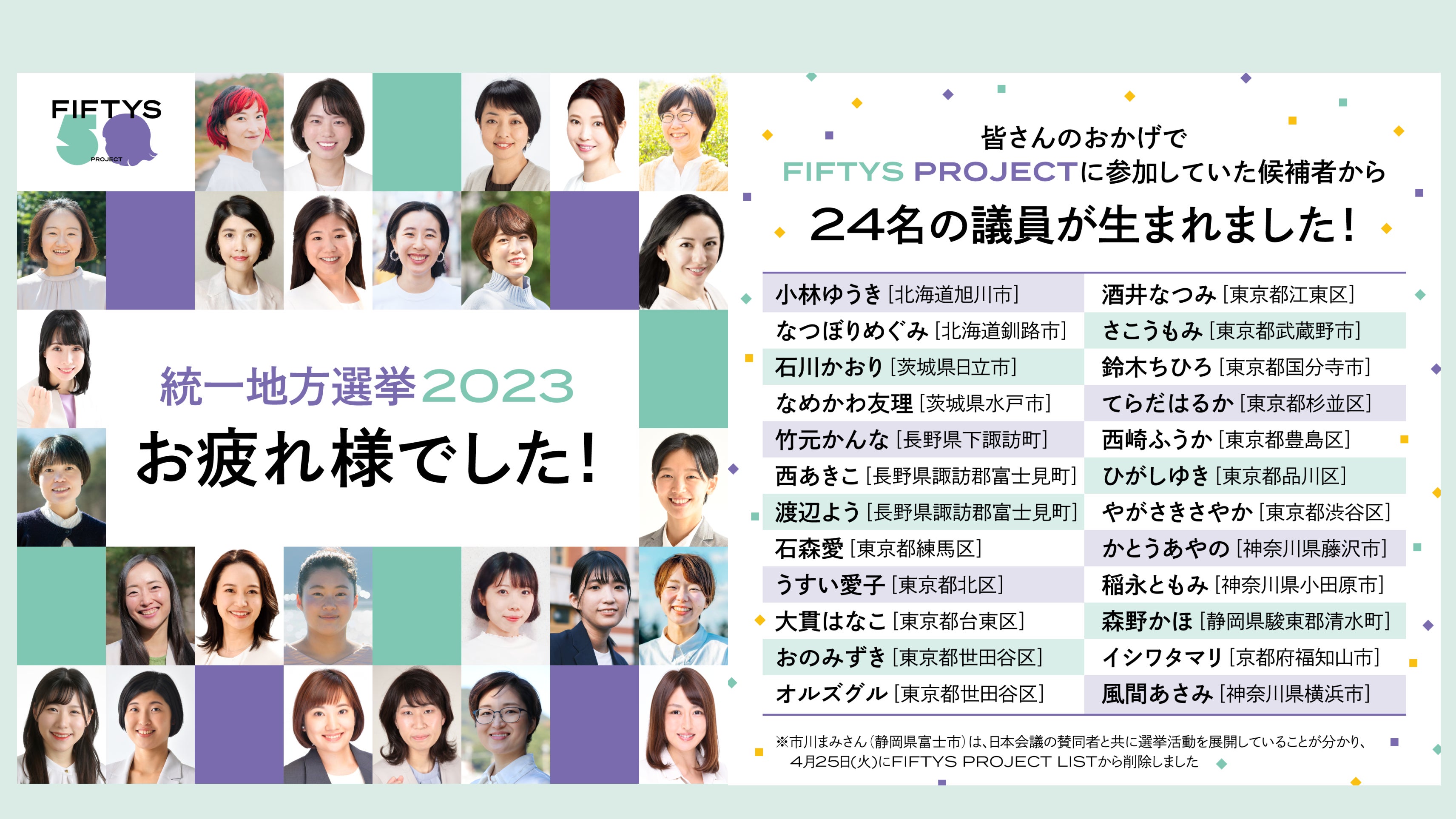◎統一地方選挙結果報告とお礼◎統一地方選挙お疲れ様でした!FIFTYS PROJECT LIST候補者の当落についてお伝えします。●当選者数 24名●(立候補者数29名)4月9日投票日都道府県議会議員選挙 2人挑戦、当選0人政令指定都市議会議員選挙2人挑戦、当選1人4月23日投票日一般市区町村議会議員選挙25人挑戦、23人当選わたしたちにはまだ、できることがある。わたしたちが動いたら、変わることがある。残念ながら落選だった人も含めて、候補者の挑戦と一緒に応援した皆さんの参加に希望を持った統一地方選挙でした。ありがとうございました。今回見えた課題もシェアして、これからのジェンダー平等を目指す動きに繋げていきましょう!政治家になった人に任せきりにしては、これまでと同じで何も変わりません。議会の景色が1つ変わったなら、私たちがどう動くかが次に問われているようにも思います。まだまだ議員に女性割合は1割台。根深いジェンダー不平等は、1回の選挙ですぐに変わるわけではないけれど、それぞれができることを考え、横につながりこれからも一緒に動いていきましょう。その支えに、そのきっかけにFIFTYS PROJECTが存在できたら嬉しいです。活動継続のためのクラウドファンディングも実施中です。ご参加いただけるとありがたいです!どうぞよろしくお願いします。
