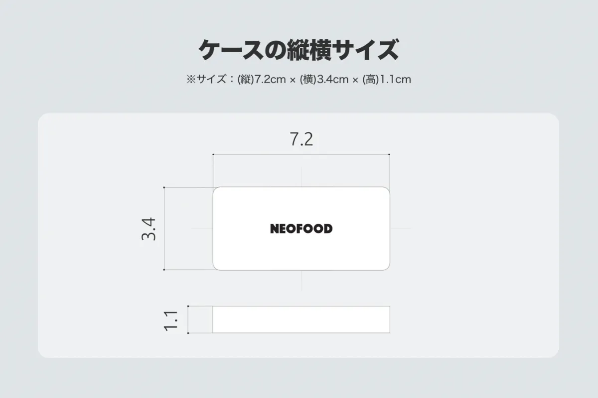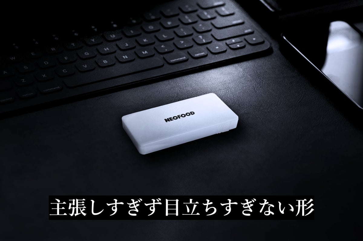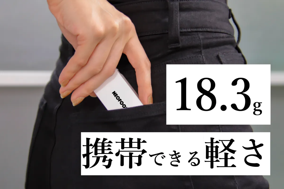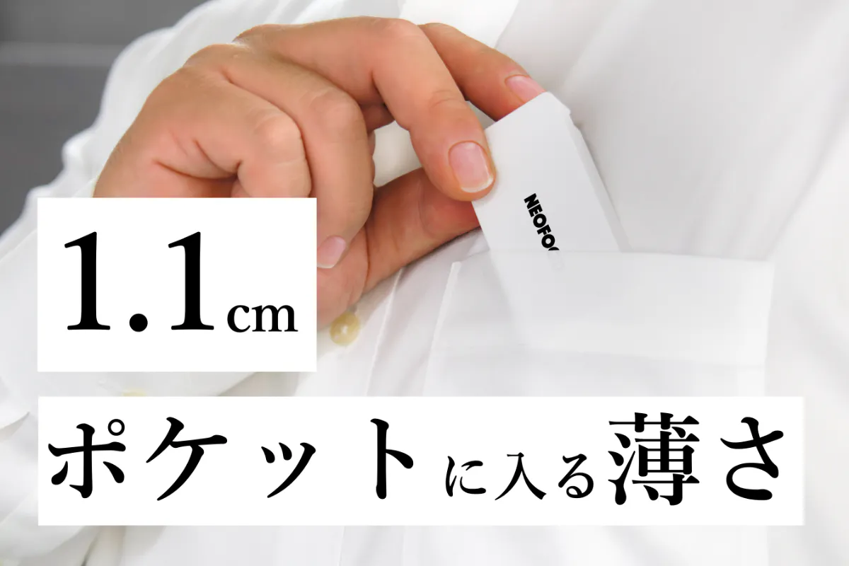 携帯性を実現するために、手のひらに収まる名刺サイズであり、ポケットに入れても膨らまず不自然にならない薄さを追求しました。一見すると小さければ小さいほど良いように思えますが、小さすぎると逆に落としてしまったり隙間に入ってしまったりと紛失する可能性があるので、ちょうど日常で見慣れていて邪魔にならないサイズ感になっています。スーツの胸ポケットに入れたり、ズボンのポケットに入れたり、デスクの横に置いても全く不自然ではありません。また「18g」と超軽量なので、持ち運びにも最適で、歩きにくさも感じさせません。