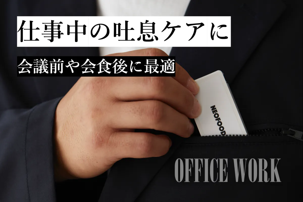 ミーティング前・会食後・デスクワークでも吐息ケアとしても活躍して栄養も同時に摂れます。吐息ケアの用途があるため、仕事中であってもマナー違反になりません。