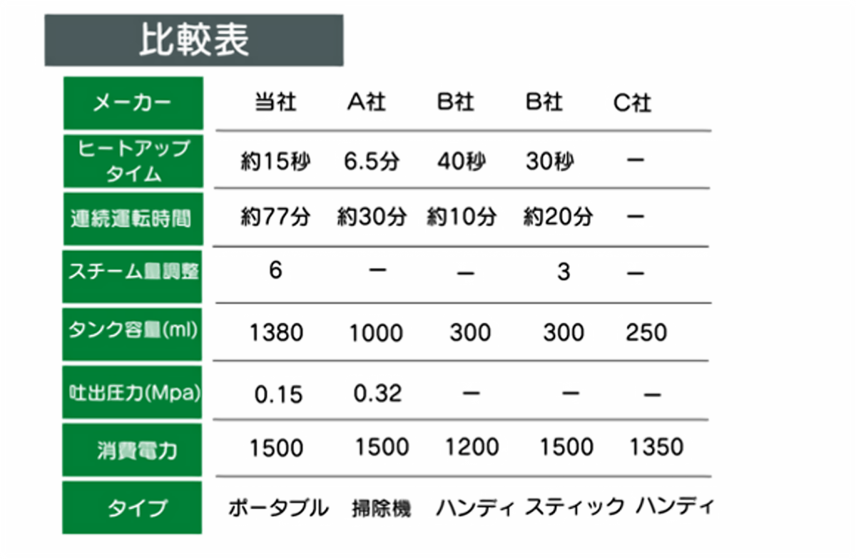 A.スチーム量を6段階調節できます。最小のスチーム量の場合運転時間が約77分となります。汚れの度合いにより調節してご使用ください。