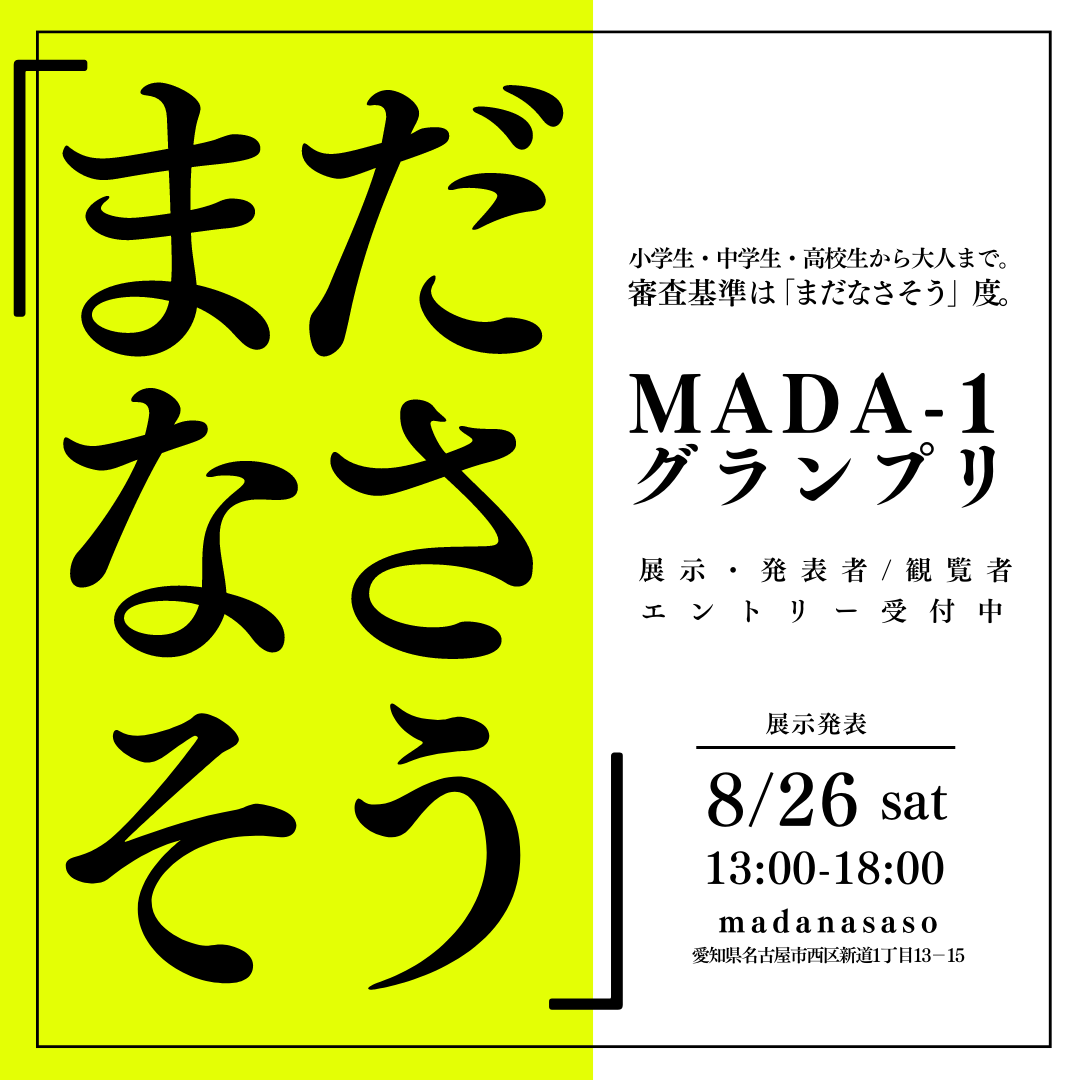 2023/07/14 19:47「まだなさそう」って素晴らしい。未来はきっと今はまだないもので溢れている。そしてそんなまだないものは、最初は誰にも理解されないものかもしれない。誰にも理解されなくても、そこに何の意味があるかまだわからなくても、まずは「とりあえずやってみる」。世の中の「まだなさそう」に向き合う拠点「madanasaso(マダナサソウ)」にて、まだなさそうなアイディア・プロジェクトの展示・発表を行うコンテストを開催します。エントリー期間中、滞在制作場所としてもmadanasasoを開放します。(詳しくはお問い合わせください)アイディアを形にしたいクリエイターの方も、新しいことに向き合いたい会社員の方も、社会にうずうずしている学生さんも、家では作れないものを作ってみたい小学生・中学生・高校生の皆さんも、「とりあえずやってみる」。ご参加ください。エントリー・詳細はこちらから↓https://mada-1.peatix.com/view もっと見る