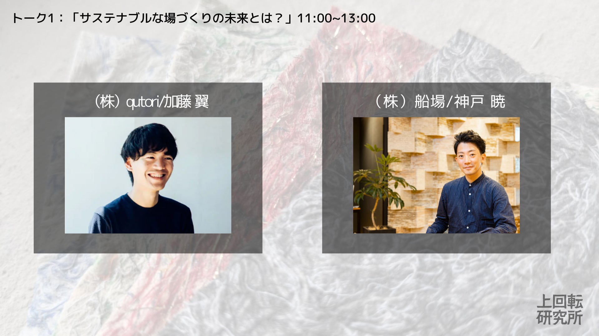 建築という視点から、業界では一早くエシカルなことを実践されている(株)船場の執行役員である 神戸 暁さんと、渋谷QWSや100banchなど大企業とクリエイター・起業家を繋ぐ場をたちあげた(株)qutoriの 加藤 翼さんにお話ししていただきます。
