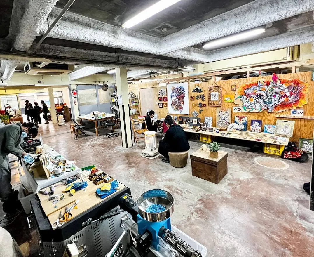 --- 2階ではトークイベントと飲食。 並行して1階では展示やワークショップ。 その場でものづくりをしている人もいて、解体した土壁を3Dプリントで再生したり、竹でテントつくったり、街にある建物を3Dスキャンして3Dプリンターで型を作って飴にしたり、出展者同士でライブアートが始まったり。 謎の歓声と笑い声が起きる1階と、真剣に学び質問を交わす2階という交差。