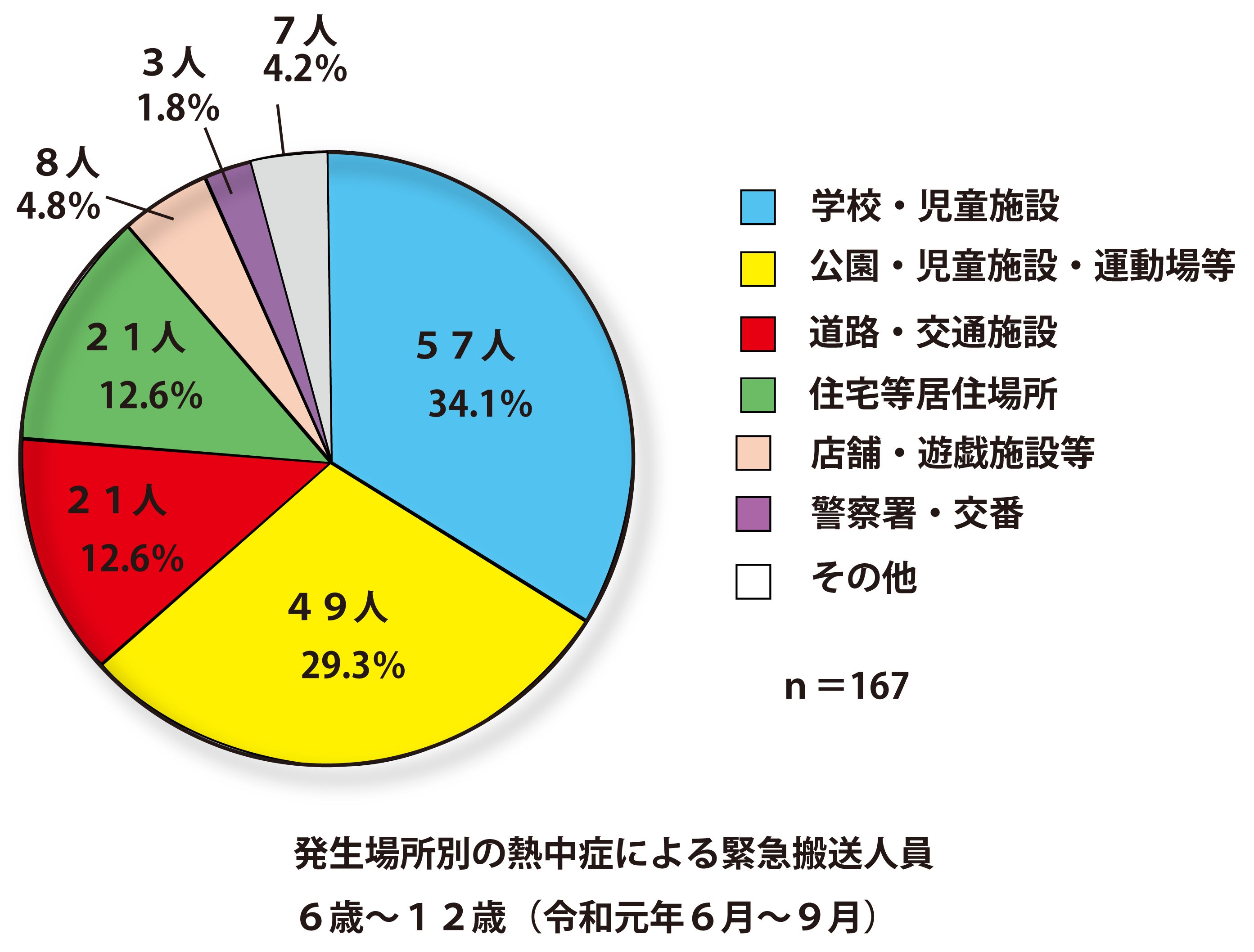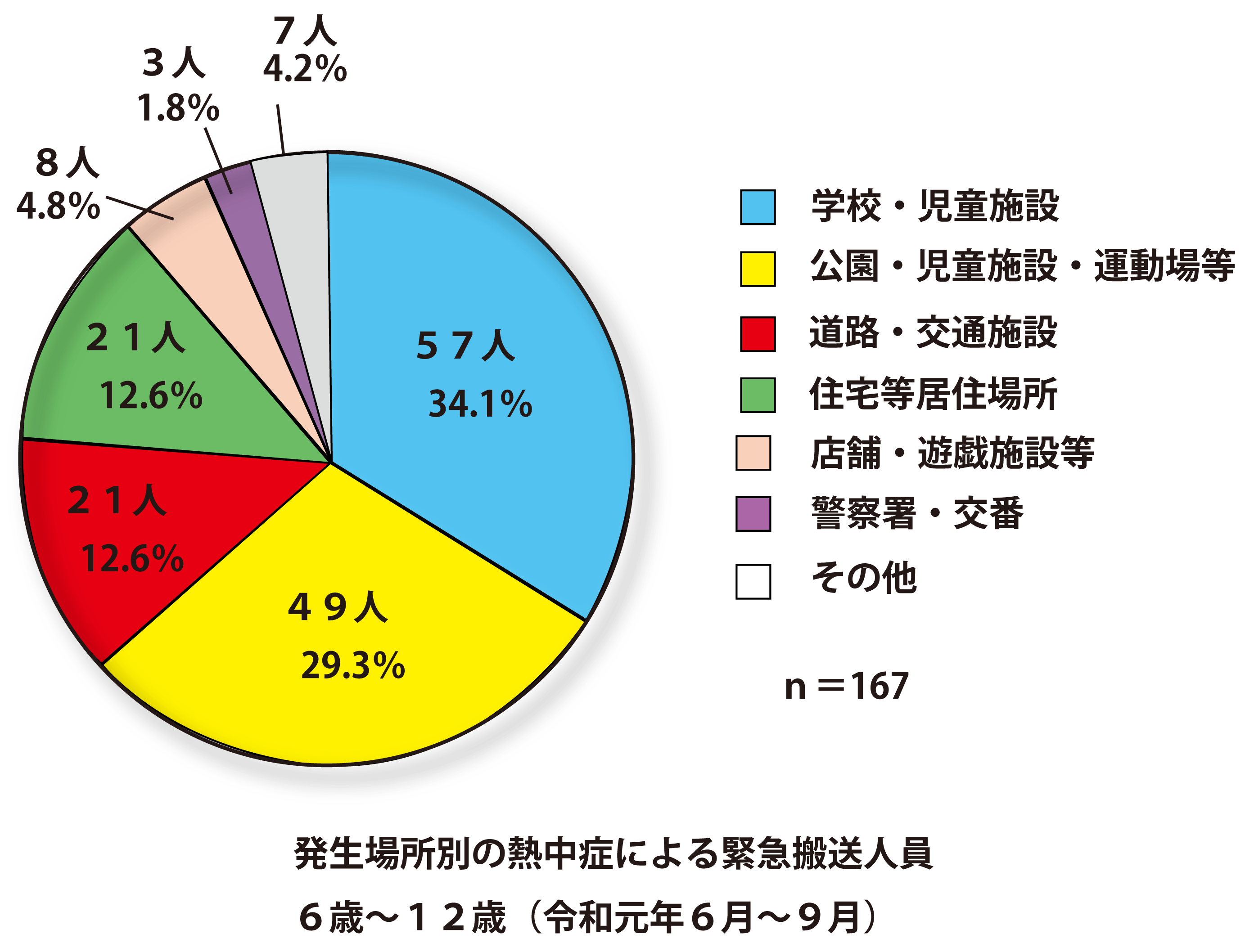 東京消防庁のホームページを見ると6歳〜12歳の発生場所別の熱中症による緊急搬送人員の約35%が学校・児童施設というデータがあります。